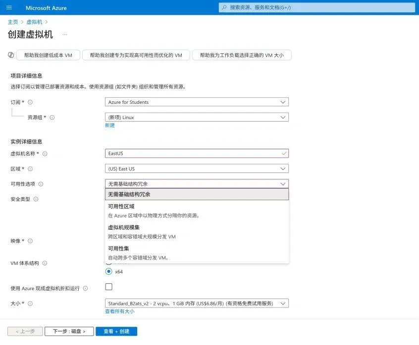 在创建虚拟机界面将订阅改为 Azure for Students,可用性选项选择无须基础结构冗余,大小选择 B1、B2pts v2(基于 Arm)和 B2ats v2(基于 AMD)三者之一。区域可以参考 Azure Latency Test ↗](https://www.azurespeed.com/Azure/Latency ↗) 这个网站上的测速结果,选择一个延迟比较低的即可。不过这一步也需要考虑你所部署的服务类型,比如 OpenAI 的相关服务在EastAsia 也就是香港,可能就无法正常运行。